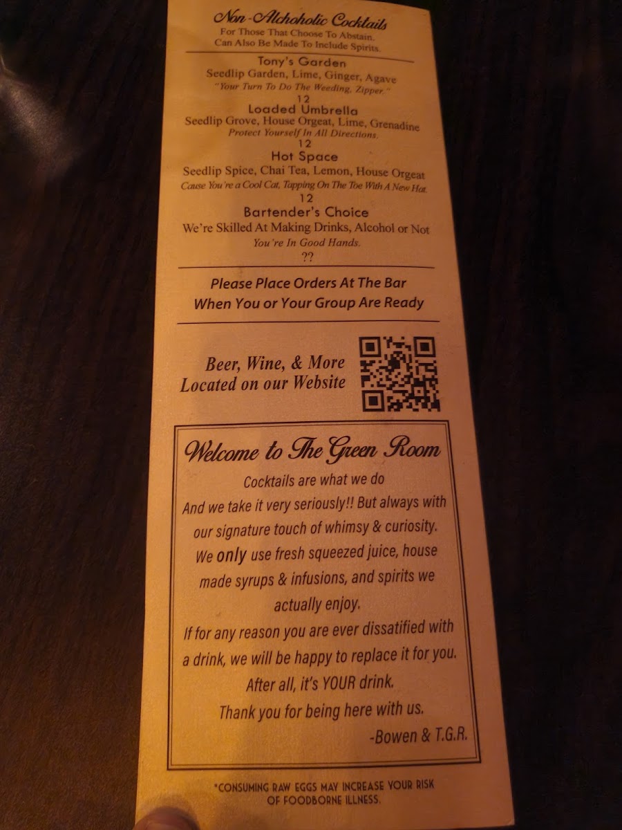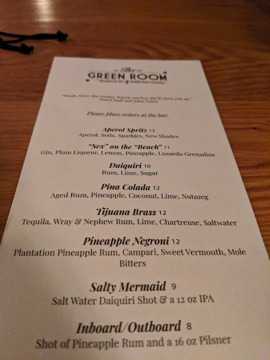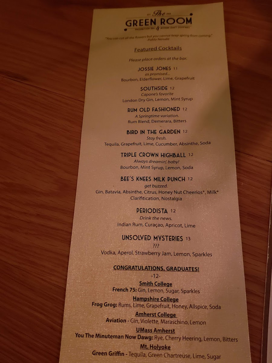 Welcome to Green Room, a distinguished cocktail bar located at 28 Center St, Northampton, MA. This is not just a place to enjoy drinks; it’s an experience that tantalizes the senses. The menu showcases an array of thoughtfully crafted cocktails, each priced at $14, including the Regal Amburana and the elegant Death & Taxes Martini. Beyond the impressive selections, the bartenders excel in creating bespoke drinks tailored to individual preferences.